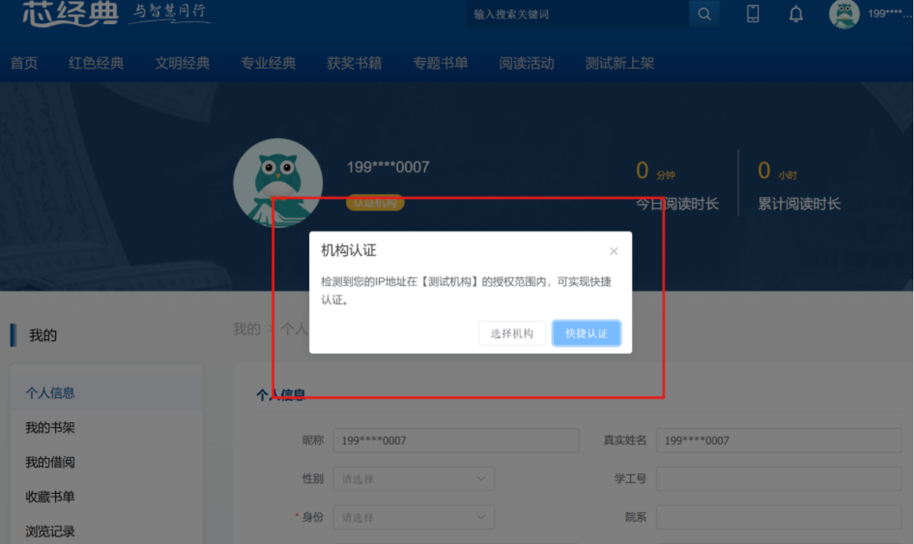 第二步:账号注册后,弹出机构认证页面,点击【快捷认证】或选择/检索【上海商学院】实现认证后开启阅读学习之旅。