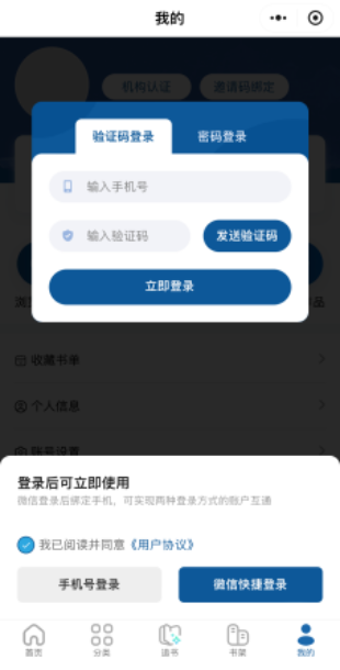 第一步:首次访问的读者需连接校园网WiFi后,扫描下方小程序二维码或点击链接进入平台,在提示登录页面,点击【微信快捷登录】或输入【手机号+验证码】完成账号注册。